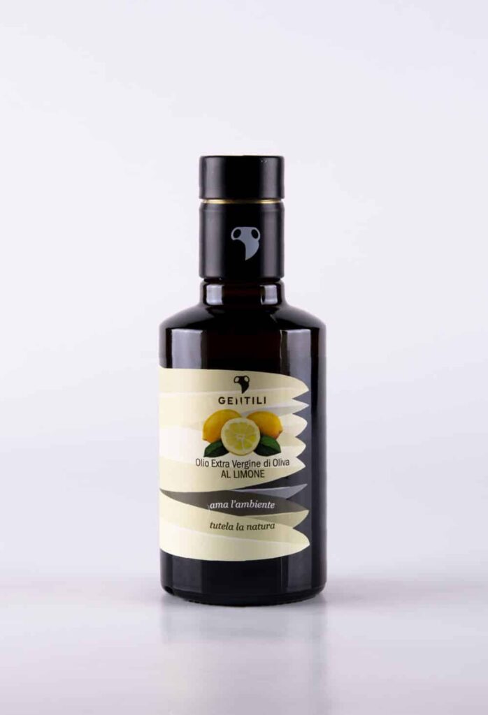 Pungente e delicato allo stesso tempo, è un prodotto realizzato a filiera corta. Una grande pianta di rosmarino nei terreni circostanti al frantoio offre una buona materia prima, che alimenta la produzione di olio EVO aromatizzato non per infusione, ma per macerazione, fino ad ottenere un olio di qualità superiore, dall’inconfondibile aroma al rosmarino. Partendo dall’Olio EVO Gentili, l’elemento centrale di questo aromatizzato è il rosmarino, le cui note decise vengono ammorbidite dalle varietà di olive spremute per ottenere l’EVO, che vanno ad impreziosire qualsiasi tipologia di carne e di pesce in alcuni casi. Sfizioso e stravagante, questo olio EVO di qualità superiore aromatizzato naturalmente al rosmarino tramite macerazione e gramolatura fatta insieme all’olio, Romolo garantisce che è in grado di dare una spinta ad ogni piatto, ma con eleganza. Proseguendo con la descrizione degli aromatizzati Gentili, analizziamo uno dei più difficili traguardi di questa filiera, per sua stessa (Romolo) ammissione, l’olio EVO al limone.