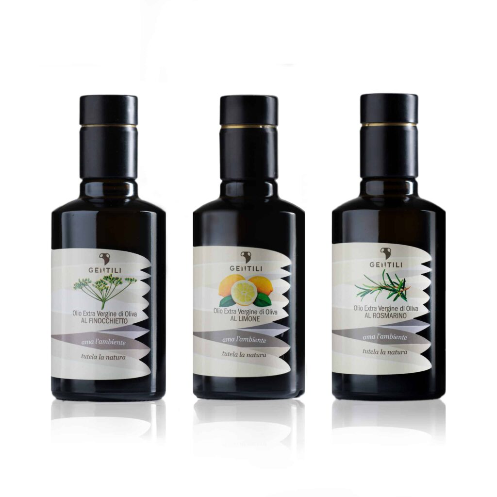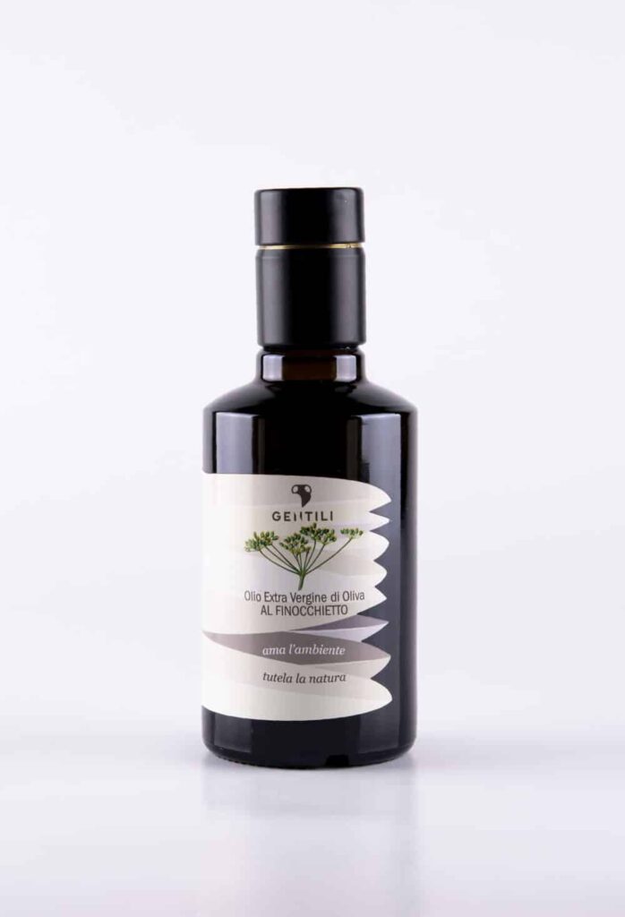 I boschi e i campi che costeggiano l’azienda Gentili, sono ricchi di finocchietto selvatico che qui nasce spontaneo da secoli. Il processo di estrazione è sempre lo stesso, tramite macerazione e gramolatura della pianta giovane con le varietà di olive scelte per l’olio EVO Gentili, per ottenere un prodotto dalla grande personalità. Il sentore intenso e tipico del finocchietto si sposa perfettamente con l’olio Gentili, grazie ad una ricetta vincente che mantiene l’inconfondibile profumo del finocchietto selvatico, in un blend di olive dal carattere deciso e pronto ad esaltare piatti di carne alla brace, arrosti e zuppe di legumi, da provare assolutamente su un piatto di pasta e fagioli.