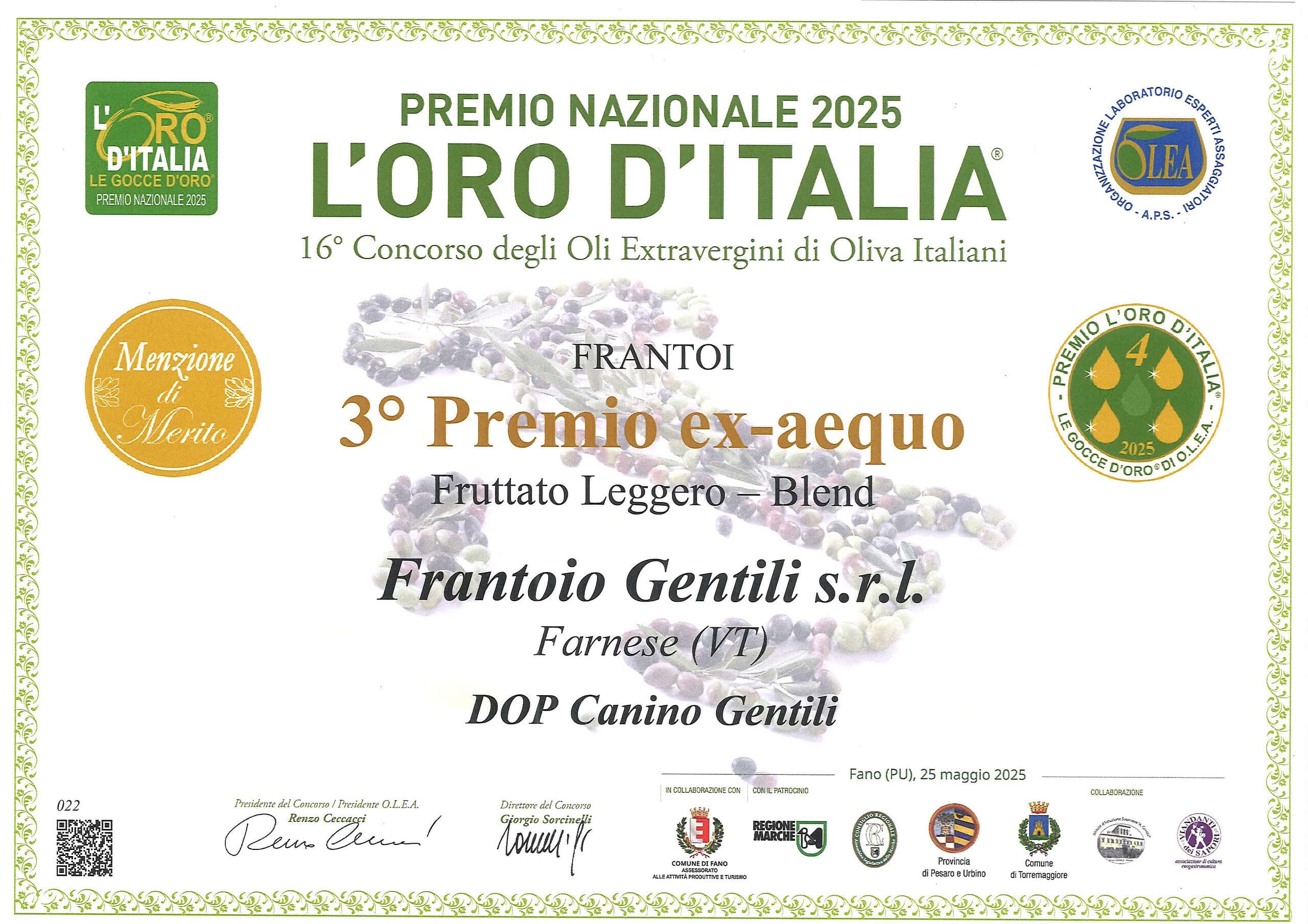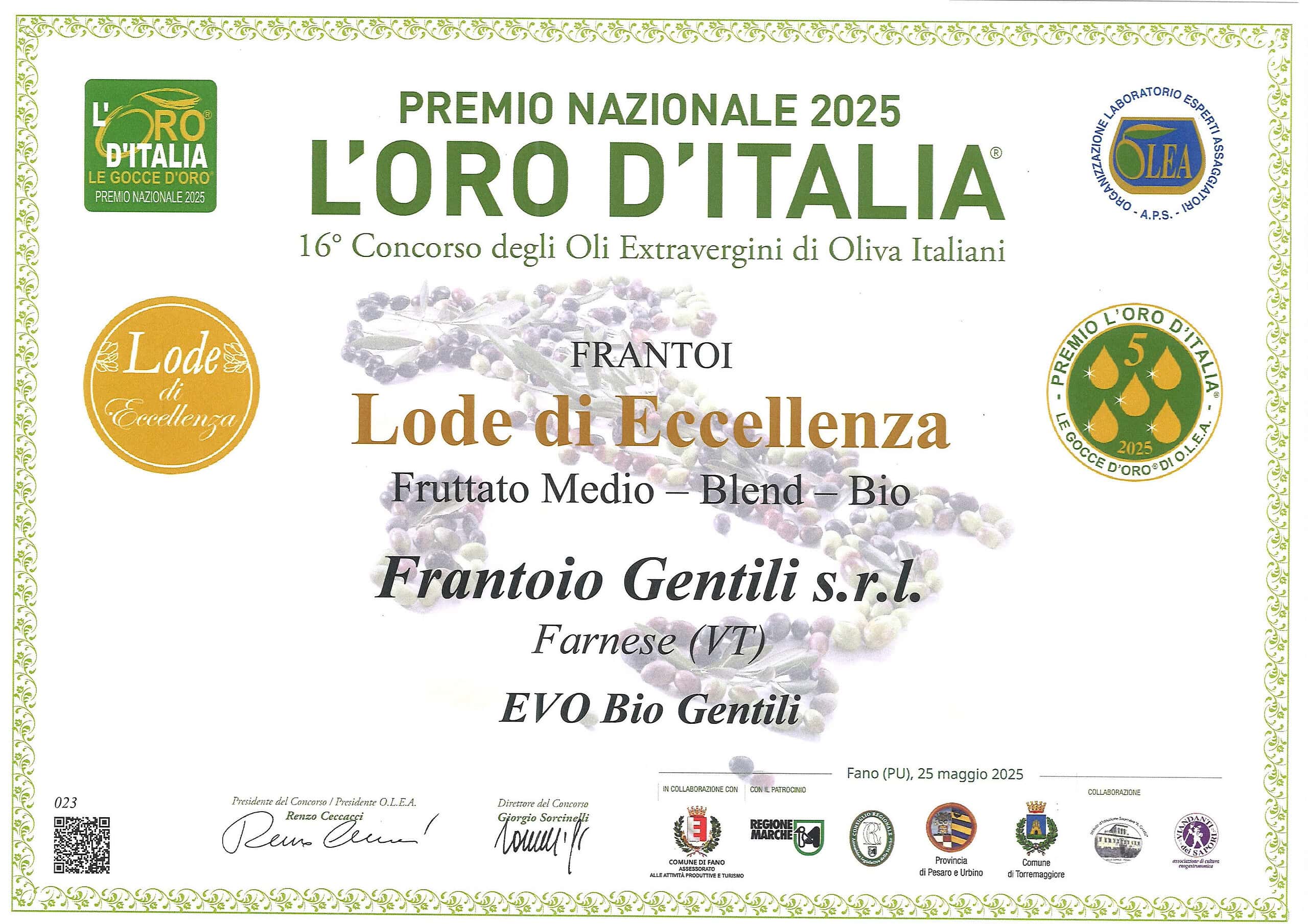 - 25 Maggio 2025. Premio Nazionale 2025 L’Oro d’Italia – 16° Concorso degli Oli Extravergine di Oliva Italiani ( visualizza 3° premio ex-aequo Fruttato Leggero Blend – Visualizza premio Lode di Eccellenza Fruttato Medio Blend BIO)