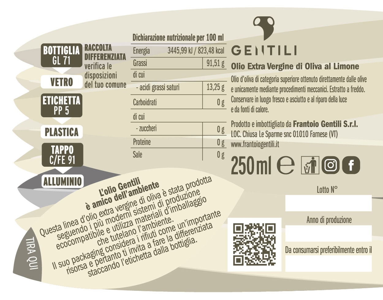 Tra i più difficili traguardi nella produzione degli aromatizzati Gentili c’è sicuramente l’olio EVO al limone. Dopo anni di tentativi, fatti con prodotti diversi (diverse tipologie di limone) Romolo pare abbia trovato la quadra con un fruttivendolo locale che gli ha proposto un prodotto più che adatto per il matrimonio con il suo olio. Acidulo e deciso il gusto del limone non si abbina così facilmente con l’olio, per questo Gentili ha iniziato un lungo lavoro di sperimentazione tra le sue cultivar che lo ha portato ad ottenere un prodotto fresco ed equilibrato adatto per molti generi di condimenti. I limoni provengono da un agrumeto di fiducia, la cui scorza entra nel processo di lavorazione delle olive fin dalla macerazione, per ottenere un olio EVO di qualità superiore che mantiene i giusti sentori di limone da apprezzare su piatti freschi, crudi di pesce, carpacci e battute di carne, insalate.